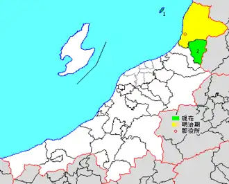* yellow - areas formerly within the district borders during the early Meiji period