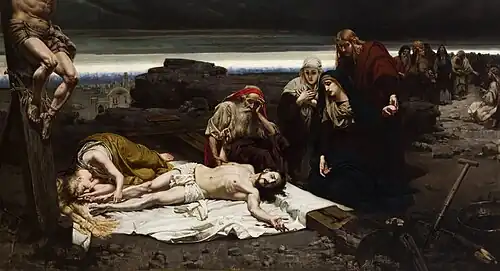 His most familiar painting, "Zdjęcie z krzyża" (picture or photograph with the Cross, a post-crucifixion scene), from 1887, is on display at the National Museum, Kraków. His works may also be seen at the National Museum, Warsaw, and the Bielsko-Biała Museum and Castle, among others. Several locations have his religious murals, notably including a Marian Cycle of six panels at St. Mary's Church, Katowice.