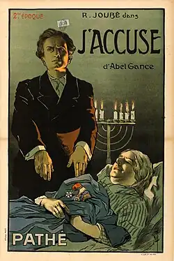 J'accuse is a 1919 French silent film directed by Abel Gance. It juxtaposes a romantic drama with the background of the horrors of World War I, and it is sometimes described as a pacifist or anti-war film.[1] Work on the film began in 1918, and some scenes were filmed on real battlefields. The film's powerful depiction of wartime suffering, particularly its climactic sequence of the "return of the dead", made it an international success and confirmed Gance as one of the most important directors in Europe.[2]