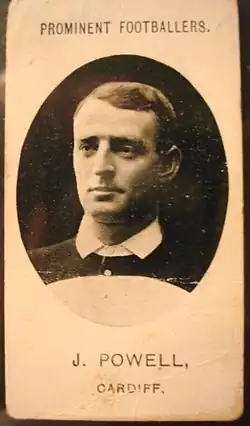 Powell first came to note as a rugby player while representing Cardiff. It was while with Cardiff that he obtained his one and only international cap, but before his full Wales cap, he played in two games against international opposition at club and county level. Both matches were against the New Zealand in their first over-seas tour of 1905/06. His first encounter with the "All Blacks" was on 21 December 1905, as part of the Glamorgan County team. Wales had played and narrowly beaten New Zealand just several days before the Glamorgan match, but several members of the Wales team failed to show, as promised, for the county match. Cardiff responded by providing five players, Powell, Gibbs, Westacott, Williams and Pullen.[2] The first half was fairly evenly matched, with Gibbs and Williams providing much of the Glamorgan threat. After the All Blacks scored a try, Glamorgan almost countered with a Gibbs kick-and-rush move, but the move broke down after Powell was knocked out in a 'lively' ruck.[3] The match ended 9–0 to the tourists, Glamorgan's first loss in five years.