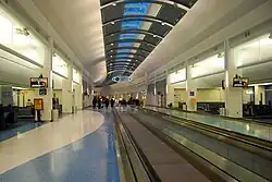 The airport covers 7,911 acres (3,201 ha) and has two concrete runways: 08/26, 10,000 x 150 ft (3,048 x 46 m) and 14/32, 7,701 x 150 ft (2,347 x 46 m).[1][14] The terminal at JAX is composed of a baggage claim area, on the first floor and a ticketing area on the second floor, at the front of the structure. Past baggage claim and ticketing is the mezzanine, where shops, restaurants and the security checkpoint are located. Beyond the mezzanine are the airport's Concourses A and C, which include 10 gates each (for a total of 20), along with other shops and restaurants.[15]