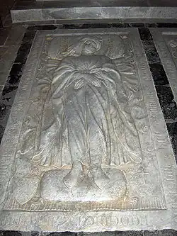 In 1412, contracted by a wealthy merchant Lorenzo Trenta, he started the design of the Trenta Chapel in the Basilica di San Frediano in Lucca. In 1413 he was accused, together with his assistant Giovanni da Imola, of serious crimes: theft, as well as rape and sodomy of one Clara Sembrini.[2] He fled to Siena (and began working on the Fonte Gaia), but his assistant was incarcerated for three years. Jacopo della Quercia only would return to Lucca in March 1416, given a letter of safe conduct. He continued at the Trenta Chapel on the marble altar and several statues of saints, contained in niches. Some work was also performed by his assistant. Jacopo also designed the tomb slabs of Lorenzo Trenta and his wife Isabetta Onesti, on the pavement in front of the altar.