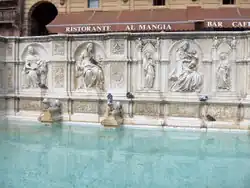 In 1406 he was asked to build a new fountain in the Piazza del Campo in Siena. It had to replace the original fountain with a statue of the goddess Venus. This pagan statue was blamed for an outbreak of the Black Plague. The statue was destroyed and buried outside the city walls to avert its "evil influence". This prestigious commission shows that he was already being recognized as Siena's most prominent sculptor. The rectangular fountain, built in white marble, was dedicated to the Virgin, adorned on the three sides by many statues and multiple spouts. Because he accepted also other commissions at the same time, progress was slow. He started in 1414 and the fountain was only finished in 1419. He carved the panels in the cathedral's workshop. The workshop today is converted into the Cathedral Museum. The fountain was called Fonte Gaia, because of the joy and the festivities when it was brought into operation. It is now a centre of attraction for many tourists. The old statues were replaced by copies in 1858 from Tito Sarrocchi and are on display in the lower levels at Santa Maria della Scala.