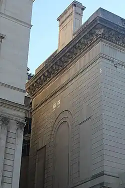 The second story is treated like a mezzanine, with small rectangular windows.[3][23] On the southern elevation, the second story has three square windows, which are flanked by console brackets that hold up the third-floor balcony.[14][3] The brackets extend the whole height of the second floor, an intentional design choice that was meant to make the second floor appear as small as possible.[14] At the second story, the western elevation has one square window, while the eastern elevation has two square windows in the front and four larger windows in the rear.[3]