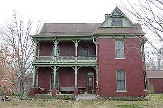 The James A. Rice House is a historic house at 204 Southeast Third Street in Bentonville, Arkansas. It is a 2+12-story brick structure, with tall arched windows and a bracketed cornice typical of the Italianate style. It has a two-story porch, asymmetrical massing, and a steeply pitched roof with cut-shingle gable finish typical of the Queen Anne style, which was in fashion when it was built c. 1879. Its builder and first owner was James A. Rice, a local lawyer who served two terms as mayor of Bentonville.[2]