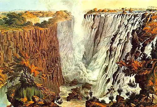 By 1854 he had teamed up with Samuel H. Edwards, another explorer, and launched an expedition to Lake Ngami after which he trekked through the territory between Northern Bechuanaland and the Zambesi. An easygoing man, he was able to get on with the Bushman hunters of the semi-desert interior and spent long periods in their company, obtaining valuable help from them. Returning to Ngami, he travelled north to the Okavango River, crossing Damaraland and reaching Walvis Bay. Here he busied himself with cattle-trading in Damaraland, before setting out on an expedition with his brother Henry and Thomas Baines and lasting from December 1860 to September 1864. Their aim was to explore the Zambesi from the Victoria Falls down to its delta, with a view to testing its navigability. However, these plans were bedevilled by sickness and misfortune. They did reach the Zambesi, but did not get to explore the mouth. On 23 July 1862 they reached the Victoria Falls. It was on this expedition that Baines painted many of his famous scenes which were reproduced in an album of prints. His attempt at exploring the Zambesi ruined his health and exhausted his finances. He returned to Cape Town in 1864, dispirited and fever-stricken. The expedition was notable since it was the first time that a stereoscopic camera had been used to record its progress. The size of the negatives was about 6 x 4.5 inches and of rather poor quality. Prints of these photographs are at the Africana Museum in Johannesburg.