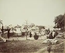 Lucknow Residency. Original graves of General Neill and others seen at the left, Sir Henry Lawrence's tomb is at the right.