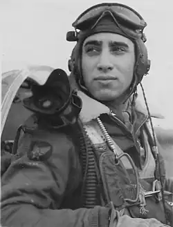Jabara joined the Boy Scouts, eventually becoming an Eagle Scout.[5] At an early age, he was set on becoming a pilot, "I used to read articles about [Eddie] Rickenbacker and all these novels you read about air combat, and I guess from the sixth grade it was my ambition to be a fighter pilot."[6] He worked at his parents' grocery store[7] and graduated from Wichita North High School in Wichita, Kansas in May 1942. Standing five feet, five inches (165 cm) tall,[8] Jabara was short for a potential fighter pilot (and was reportedly required to wear corrective eyewear[7]), but this did not prevent him from immediately enlisting as an aviation cadet of the United States Army Air Forces at Fort Riley, Kansas.[9] In an attempt to improve his eyesight for flying, he ate 20 carrots a day in the mistaken belief that this would improve his vision.[10] After attending four flying schools in Texas, he received his pilot's wings and a commission as second lieutenant at Moore Field, Texas in October 1943.[9][11] Jabara with his wife, Nina, had four children: James William (b. 1949), Carol Ann (b. 1950), Cathy (b. 1952), and Jeanne (b. 1957).[12][13][14]