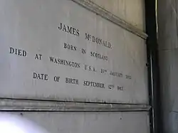In 1906, McDonald developed an affliction of the heart and was compelled to retire from all active business. After that time, he travelled to different parts of the world in search of health, under orders of his physicians to avoid exertion, physical or mental, as much as possible. Finding it necessary to live in a warm climate, he went to Southern California in the winter of 1911–1912 and spent the season there, planning the return each winter in the future. McDonald died on January 13, 1915, in Washington, D.C.[2] and was buried in the family mausoleum in Brompton Cemetery.