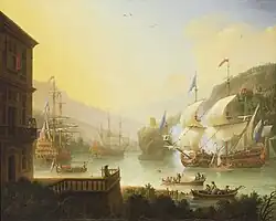 The National Maritime Museum at Greenwich has two paintings by him showing English warships: The Royal Prince before the Wind, (1679)[6] and Shipping in an Estuary (1701). The latter, an idealised sunlit scene, painted after his move to France, is his last signed and dated work.[7]