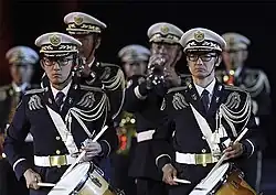 The JGSDF Band was created in the summer of 1951 under the as part of the National Police Reserve (formerly the National Safety Force), the predecessor agency of the JGSDF. With the NPR only being an armed national police force rather than a national military, the JGSDF Band was the first military band to form in modern Japan. Its history is rooted in the long heritage of Japanese military music, and more specifically the Imperial Japanese Army Band beginning in the 1880s. In the last half-century, the JGSDF Band has gained the nobility of being the senior most ground force and self-defence force wind band, serving as one of many ceremonial military and paramilitary units that serve the Emperor and the Imperial Family during state visits and other official functions.[5] Musicians of the band have since 2015 taught personnel of the Papua New Guinea Defence Forces Band.[6] It participated in the 2019 edition of the Spasskaya Tower Military Music Festival and Tattoo.[7]