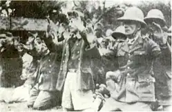 Lemonnier was subsequently taken prisoner himself and ordered by a Japanese general to sign a document formally surrendering the forces under his command.[7] Lemonnier refused to sign the documents. As a result, the Japanese took him outside where they forced him to dig a grave along with French Resident-superior (Résident-général) Camille Auphelle.[23] Lemonnier again was ordered to sign the surrender documents and again refused. The Japanese subsequently beheaded him.[7] The Japanese then machine-gunned some of the prisoners and either beheaded or bayoneted the wounded survivors.[26]