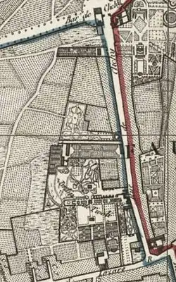 In 1766, Simon Gabriel Boutin (1720-1794), a son of the wealthy farmer-general Boutin, had several houses built in a park of eight hectares, resplendent with rare plants, English, Italian, and Dutch gardens, a bowling green, and follies including false ruins, rocky promontories, and a waterfall. He named the ensemble Tivoli in honor of the gardens of the Villa d'Este in Rome, and the Folie Boutin, as it was often called, quickly became known for its splendid gardens. Its main entrance was located rue de Clichy, with a secondary entrance on rue Saint-Lazare. Two principal buildings were at n°102, la rue Saint-Lazare, and at n°27, la rue de Clichy. A pavilion, attributed to architect François Dominique Barreau de Chefdeville (1725-1765), housed a mineralogical collection. There on Thursdays Boutin received his friends, including painter Hubert Robert and architect Alexandre-Théodore Brongniart.