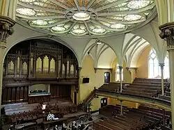 The Jarvis Street Baptist Church was designed in the Gothic Revival style by the architectural firm of Henry Langley and Edmund Burke who served for many years at Jarvis Street Baptist Church as a Sunday-school teacher, chair of the choir committee, and deacon. It was one of the first churches in Canada to be built with an amphitheatre-shaped interior. The ground floor seating is grouped in a semicircle, while the gallery above is horseshoe shaped. The gallery is supported by iron columns. Above the gallery, another set of columns support a faux-Gothic ceiling.[10]