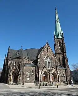 The main façade of the building is made out brown stone that is obtained from the regions of Queenstown.[11] The stone is laid unevenly with a pattern that varies in different shades of browns and dark yellows. The material used for the roof is Canadian slate. The roof is constructed from a series of pitched segments that are centrally connected by a horizontally sliced dome. There are eight entrances, each consisting of solid oak double doors framed with pointed sandstone arches. Several of these doors have been blocked off with black cast iron gates. Triangular sets of small rosette windows are placed above every door to fill the space in between the entrance and the top of the arch. The building has number of columns with slim tall shape and different capitals that are loosely based on a Corinthian order. The capitals are made of gray stone while the columns are of a high quality bronze shaded granite found in St. George, New Brunswick.[11] The main entrance is set under the only tower of the building facing the south west side which serves as a vertical axis to the building. A copper spire sits on top of the tower, adding approximately nine metres (30 ft) to the existing roof height. In addition to the vertical axis the building also has a horizontal symmetry axis that goes diagonally through the building. The flat-roofed extension of the church, built after the 1938 fire, was constructed with red brick masonry which contrasts with the charred Queenston façade.