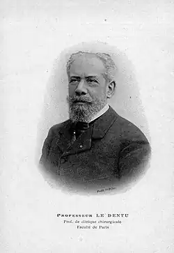 He was the author of numerous articles in the fields of surgery and urology. With Pierre Delbet (1861-1957) and others, he published the multi-volume Traité de chirurgie clinique et opératoire (1901 et seq.).[4][5] He made significant contributions to Sigismond Jaccoud's Nouveau dictionnaire de medecine et de chirurgie.[6] Other publications by Le Dentu include: