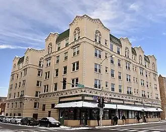 The Jeffery–Cyril Historic District is a national historic district in the South Shore neighborhood of Chicago, Illinois. The district comprises a cluster of six apartment buildings on Jeffery Boulevard, 71st Place, and Cyril Avenue. All six buildings were built between 1927 and 1929. Apartments had become a popular housing choice for middle-class families by the 1920s, when South Shore was developed; due to zoning restrictions, however, the district is the only large group of apartments in the neighborhood. The apartments reflect the diversity of late 1920s architecture; in fact, while architect Paul F. Olsen designed three of the buildings, he used a different style for each of them. Five of the buildings use revival styles, which were popular at the time, with examples of Georgian Revival, Gothic Revival, Spanish Colonial Revival, and Tudor Revival designs; the remaining building features the then-emerging Art Deco style.[2]