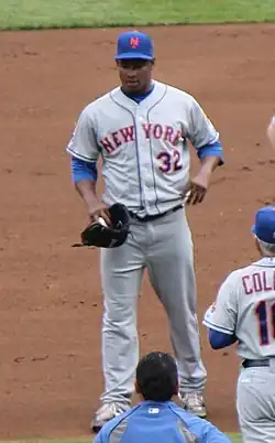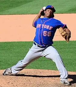 Mejía made the Mets 2010 opening day roster as a relief pitcher, at only 20 years old, making him the youngest Met to make an Opening Day roster since Dwight Gooden.[6] He made his major league debut on April 7, 2010.[9] After posting a 2.60 ERA in 30 relief appearances, on June 20, 2010, Mejía was optioned to Double-A Binghamton to become a starter, with Bobby Parnell taking his spot in the Mets bullpen.[6][10] Mejía was recalled from Triple-A Buffalo on September 1.[10] On September 4, Mejía made his first major league start for the Mets at Wrigley Field against the Chicago Cubs.[11] Mike Nickeas, who caught Mejía, also made his debut in the majors on the same day.[12]