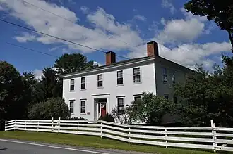 The Jeremiah Hutchins Tavern stands near the northern end of Bath's Upper Village, a cluster of residential and agricultural buildings about 1.5 miles (2.4 km) north of the village center. It is located close to the west side of United States Route 302, opposite Hutchins Lane. It is a two-story wood-frame structure, with a hip roof, two interior chimneys, and a clapboarded exterior. A two-story gabled ell extends to the rear, flush with the main block's southern facade. The main facade, facing the street, is five bays wide, with windows arranged symmetrically around the center entrance. The entrance is set in a recess with paneled sides, and sidelight and transom windows. It originally had an entrance on the north side, but it has been closed up and a bathroom placed in its stead. Much of the original interior finish work has been preserved.[2]