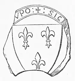 Evidence of the use of "Cantilupe ancient" last appears in the Camden roll of arms, c. 1280. for Johan de Cauntelo They are earlier listed as Gules, three fleurs de lys or for Sir George de Cantilupe (died 1273) in the Charles's Roll,[7] St. George's Roll,[8] and in the Camden Roll.[9] The arms of William de Cantilupe (died 1254) are listed even earlier in the Glover's Roll as: Gules, three fleurs-de-lys or.[10] The earliest record of the arms of "Cantilupe ancient" is in the seal of William de Cantilupe (died 1239). The antiquarian John Nichols (d.1826) in his History and Antiquities of the County of Leicester[11] records a deed dated 1215 relating to the first William de Cantilupe's manor of Brentingby, Leicestershire, on which the seal is three fleurs-de-lys circumscribed.