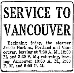 On May 6, 1904, it was announced that Jessie Harkins would be put on a route running on the lower Willamette river from Portland to St. Johns, Oregon.[7] The boat made six round trips a day, leaving the Washington Street dock in Portland at 7:00, 8:30 and 10:30 a.m, and 1:00, 2:30 and 4:00 p.m.[7] The downstream run took 30 minutes.[7] The fare was five cents to the dry dock on the Willamette River and 10 cents to Linnton further downstream.[7]