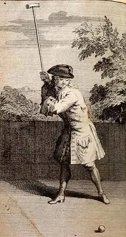 Jeu de mail or jeu de maille ('pallamaglio' in Italian, Middle French for 'mallet game', or sometimes interpreted as 'straw game') is an ancient outdoor game, originally from Naples,[1] which gave rise to numerous modern sports, such as golf, croquet, hockey and its variations, and polo.[2] It is a now-obsolete lawn game originating in the Late Middle Ages and mostly played in the Kingdom of Naples and France,[3] surviving in some locales into the 20th century. It is a form of ground billiards, using one or more balls, a stick with a mallet-like head, and usually featuring one or more targets such as hoops or holes. Jeu de mail was ancestral to the games golf, palle-malle and croquet, and (by moving it indoors and playing on a table with smaller equipment), billiards.