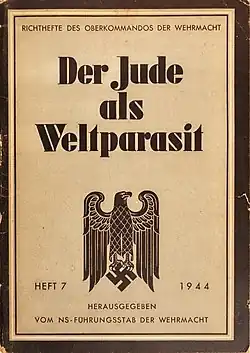The "Jewish parasite" is an antisemitic trope used mostly by the Nazi Third Reich.[1] It is based on the myth that the Jews of the diaspora are incapable of forming their own states, and would therefore attack and exploit states and peoples. The stereotype is often associated with the accusation of usury, and the separation of productive capital and financial capital ("High Finance").