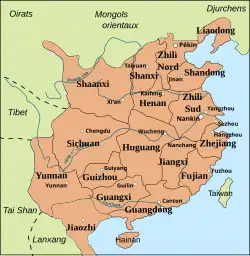 • 15 prefectures: Jiaozhou (交州), Beijiang (北江), Liangjiang (諒江), Sanjiang (三江), Jianping (建平, Kiến Hưng in Hồ dynasty), Xin'an (新安, Tân Hưng in the Hồ dynasty), Jianchang (建昌), Fenghua (奉化, Thiên Trường in the Hồ dynasty), Qianghua (清化), Zhenman (鎮蠻), Liangshan (諒山), Xinping (新平), Yanzhou (演州), Yian'an (乂安), Shunhua (順化).