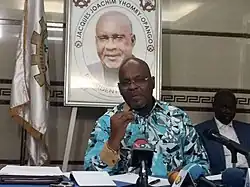 Afterward, Yhombi-Opango was the candidate of his party, the Rally for Democracy and Development (RDD), in the August 1992 presidential election, taking sixth place with 3.49% of the vote.[14] In his native Cuvette Region, he placed second, with 27% of the vote, behind Sassou Nguesso.[15] He allied with President Pascal Lissouba and Lissouba's party, the Pan-African Union for Social Democracy (UPADS), in the first round of the 1993 parliamentary election, held in May, and after the election, Lissouba appointed him as Prime Minister on 23 June 1993. The opposition contested the results, however, and a severe political dispute erupted, with the opposition setting up a rival government.[16] Yhombi-Opango resigned on 13 January 1995 so that Lissouba would be free to consult other parties in the formation of a new government; he was promptly reappointed as Prime Minister, with a new government—including four members of the opposition Union for Democratic Renewal (URD)—being named on 23 January.[17]