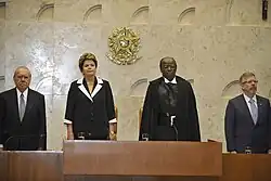 From left to right: José Sarney (then President of the Senate), Dilma Rousseff (then President of Brazil), Barbosa and Marco Maia (then President of the Chamber of Deputies) during the tenure of Barbosa as President of the Supreme Federal Court, November 22, 2012.