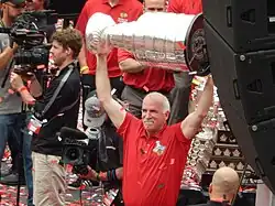 Joel Norman Quenneville (born September 15, 1958) is a Canadian–American professional ice hockey coach and former player who is the head coach for the Anaheim Ducks of the National Hockey League (NHL). Nicknamed "Coach Q", he is second in NHL coaching wins at 969 behind Scotty Bowman. Quenneville achieved his greatest success as head coach of the Chicago Blackhawks, a team he coached from 2008 to 2018. He led the Blackhawks to three Stanley Cup titles in 2010, 2013 and 2015. The team's championship victory in 2010 was the Blackhawks' first since 1961, ending the then-longest Stanley Cup drought.