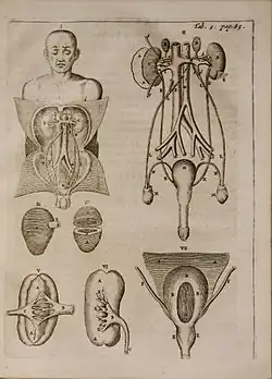 Vesling is best remembered for the 1641 publication of Syntagma anatomicum, publicis dissectionibus, in auditorum usum, diligenter aptatum, a popular textbook based on his anatomical dissections in Padua. In this work he provided an early discussion of the human lymphatic system, and included the earliest sketches of the lacteals in humans.[3] Vesling also performed important studies of blood circulation, and was one of the first physicians to describe the brain's circle of Willis.[4]