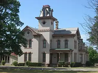 John Badlam Howe Mansion is a historic home located on the grounds of Howe Military School, in Howe, Lima Township, LaGrange County, Indiana. It was built in 1875–1876, and is a two-story, Italianate style white brick building trimmed with stone and terra cotta. It measures 51 feet by 78 feet, and features a three-story, central tower with a Second Empire style mansard roof.[2]: 5
