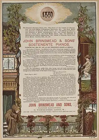 In recognition of exhibits in the Paris Exhibition of 1878, John Brinsmead was awarded the Legion of Honour by the French government.[2] In 1883, the company gained the right to place "Pianoforte Makers to HRH the Prince of Wales" on their pianos.[4]