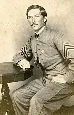 James graduated from the Virginia Military Institute with second honors on July 4, 1866.[3] During his college career, he served in the Confederate Army, acting as a color guard and third corporal in the Battle of New Market and fighting in the intermediate lines during the evacuation of Richmond in 1865.[4] His brother Fleming fought alongside him.[2]
