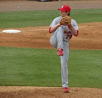 Gast began the 2013 season with the Memphis Redbirds, where he pitched thirty-two consecutive scoreless innings.[6] He was named Pacific Coast League pitcher of the week for the week ending April 21.[7][8] Gast was called up on May 12, 2013, after Jake Westbrook was put on the 15-day disabled list.[9] He made his major league debut on May 14, 2013 at Busch Stadium against the New York Mets. Gast threw five shutout innings but gave up four runs in the sixth inning. He gave up six hits total, walked one, and struck out three to earn his first victory as a Cardinal.[6] Gast won in his second start with the Cardinals as well, giving up two runs on four hits and two walks over 5 innings as St. Louis beat the Milwaukee Brewers 4-2.[10] He was placed on the disabled list on May 26, after suffering a shoulder strain.[11] On July 26, 2013 Gast underwent season-ending surgery on his left shoulder. According to the Cardinals John Mozeliak that the expected recovery and rehabilitation time is between eight and twelve months.[12] It is the second major surgery for Gast, his first being Tommy John surgery while he was a high school senior.