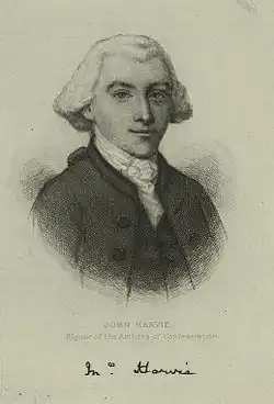 John Harvie (1742 – February 6, 1807) was an American Founding Father, lawyer and builder from Virginia. He was a delegate to the Second Continental Congress, where he signed the Articles of Confederation, in 1777 and 1778. He was a successful lawyer and landowner, as well as the fourth mayor of Richmond, Virginia. Thomas Jefferson was a friend since his childhood; his father was Jefferson's guardian. He negotiated a peace treaty in 1774 after the Battle of Point Pleasant. During the American Revolutionary War, he was on the Board of War and operated a prison of war camp on his property, The Barracks.