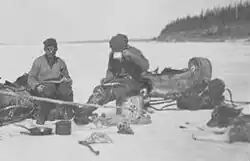 John Hornby and Norman Robinson and their dogs stop for tea on a frozen river.