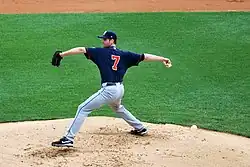 Maine delivering a pitch in July 2006 against the Houston Astros, en route to a complete game shutout during his scoreless innings streak.