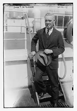 Born into a Roman Catholic family, McGovern soon became involved in the Labour movement and anarchism. Active in opposition to the First World War, he joined the Anti-Parliamentary Communist Federation and became its treasurer but soon left after disagreements with Guy Aldred.[1] He was a conscientious objector.[2] He emigrated to Australia in 1923, but soon returned and became a prominent member of the Independent Labour Party (ILP), at the time linked to the Labour Party. In 1929 he was elected to Glasgow City Council, a position he held for two years.[3]