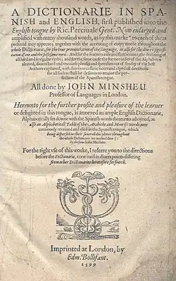 • Dictionarie in Spanish and English (1599 & 1623), an augmented version of Bibliotheca Hispanica (1591) by Richard Percyvall (1993 reprint: ISBN 3-89131-066-8)