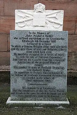 Nisbet was eventually captured at Fenwick and following trial was executed in the Grassmarket in Edinburgh on 4 December 1685 by hanging.[17] Nisbet is buried at Greyfriars Kirkyard in Edinburgh, and there is a memorial monument at Loudoun Parish Kirk in Newmilns.