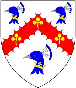 He was the son of Michael Ridgeway of Newton Abbot, Devon, a brewer,[2] the name of whose wife is not recorded. Vivian (1895) suggested he was the son of Stephen Ridgeway, Mayor of Exeter in 1491.[3] An alternative surname of "Peacock", to that of Ridgeway, was declared in 1564 by his descendant to the heralds at the Heraldic Visitation of Devon, but this name has not been found in other surviving records.[4] The ancient arms of "Ridgway" as recorded by Pole do however make a canting reference to this "alias": Argent, on a chevron engrailed gules three trefoils or between three peacock's heads erased azure crowns about their necks or.[5] The family's modern arms, which they bore in the time of Pole (d.1635), were recorded by the latter as: Sable, two angel's wings conjoined tips upwards argent. These arms are displayed on the Ridgeway monument in Tor Mohun Church, and are a differenced version the arms of Barnehowse, whose co-heiress was Mary Southcott, the wife of Sir Thomas Ridgeway, son of John: Gules, two wings conjoined in lure argent.[6]