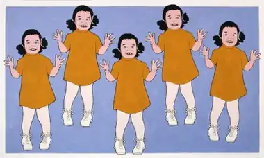In the 1970s, Wesley began to turn toward domestic scenarios that David Pagel later described as "loving dissections of ambiguity and double meaning."[5][35] In formal terms, these paintings were characterized by a freer use of line, more open compositions, and intensified color palettes dominated by candy pinks, baby blues, flesh beiges and hospital greens;[13][40] thematically, they often took a farcical, yet incisive look at gender relations, paternal power and mortality.[24][8][36] Suzanna and the Lugosis (May I Cut In?) (1972) portrayed a pale, languishing woman in the arms of a tuxedoed, pink vampire, with three identical but paler vampires lining up behind him.[35][15] In Daddy's Home (1972), Wesley duplicated a gleeful daughter figure five times, the repetition transforming an expression of uncontrollable delight into one that seemed to suggest a demonic grimace and dependence as a weapon.[5][11] Peter Schjeldahl wrote that this work signaled "a sharp, decidedly eccentric angle of vision" situated "more or less queasily, at some point on the continuum from funny‐ha‐ha to funny‐peculiar."[35]