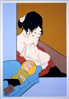Representative early comics-based works included Olive Oyl (1973), which presented that character nude, slumbering and floating with four angry, pointing infant Swee'Pea characters straddling her; Popeye (1973), a gun-wielding boy kidnapping a helpless Wimpy; and The Bumsteads (1974), which depicted Blondie sprawled across a bed, face-down and crying, bent-legged and bottomless, her foot partially covering Dagwood's face, as he leaned over from behind, his next move unclear.[5][9] Wesley's later "Bumstead" paintings "fixed on the neurotic, erotically inclined psyche of the American male,"[12] examining themes of insatiable desire and frustration, inadequacy and mediocrity, rage, longing and loss.[15] He reversed conventional gender roles in paintings like Off His Feed (1991), portraying a nude, possibly impotent Dagwood lying passive while an attentive Blondie tickled his toes; in Bumstead, Maddened by the Mistral, Fighting for His Knife (1990), two Dagwoods struggled over a murder weapon, while in Bumstead in Bedlam (1991) Wesley's Dagwood appeared in a straitjacket.[9][12] In the 2000s, he added a new twist to the Dagwood works, incorporating a female character that paid homage to the Japanese ukiyo-e genre and eighteenth-century master, Kitagawa Utamaro, in paintings that explored shared erotic preoccupations, such as Utamaro Nude, Bumstead Nude and Utamaro Washing, Bumstead Sleeping (both 2003).[40][6]
