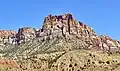 Johnson Mountain is located immediately southeast of Springdale, towering 2,200 feet (670 meters) above the town and the floor of Zion Canyon. It is wedged between the North and East Forks of the Virgin River which drain precipitation runoff from this mountain. Its nearest higher neighbor is The Watchman, 0.8 mi (1.3 km) to the north-northeast, and Mount Kinesava is positioned 2.94 mi (4.73 km) directly across the canyon to the northwest.[1] Shunesburg Mountain is set 2 mi (3.2 km) to the southeast, directly across the mouth of Parunuweap Canyon. This feature's name was officially adopted in 1934 by the U.S. Board on Geographic Names. It is named for Nephi Johnson (1833–1919), a Mormon missionary, interpreter, explorer, and the first white man to visit Zion Canyon.[3] In 1858 a Paiute guide by the name of Nauguts led Nephi into the Zion Canyon area of the upper Virgin River.[4] Johnson wrote a favorable report about the agricultural potential of the upper Virgin River basin, where he founded the town of Virgin.