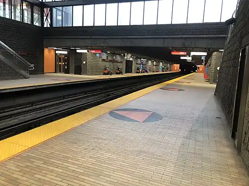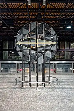 Designed by Claude Boucher, it is a side platform station, built in a shallow open cut, with the ticket hall integrated into a large glass-walled entrance pavilion. The design was influenced by the International Style architecture of Ludwig Mies van der Rohe.[5] The floor of the platform level is decorated with a series of 42 circular ceramics by the architect.[6]