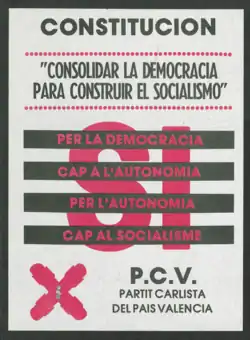 At the time political strength of Partido Carlista remained unknown; some speculated it might emerge as a significant force and Zavala might become one of key Spanish statesmen. Press published interviews with him[157] and even top national papers questioned him about future developments;[158] he was among politicians consulted by the government.[159] The cabinet had some apprehensions about potentially disruptive capacity of PC[160] and the party was among the few which were not legalized prior to the 1977 general elections;[161] its candidates ran on makeshift electoral lists and Zavala himself did not stand.[162] The first test of the party strength proved disastrous; PC gained 0.05% of the votes.[163] Zavala was subject to internal criticism, also for dictatorial leadership[164] and "represión sistemática" of his opponents.[165] In response, he organized IV Congress;[166] his "simple cure for all these ills was a call to action".[167] He stuck to the radical course; though he called for support of the constitution draft in the 1978 referendum, he declared it a transitory measure and not a firm foundation for the new Spain.[168]