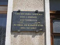 Memorial plaque at the former school in Černouček, which says that in 1929–1930 Pleva taught and wrote his best-known book Malý Bobeš here