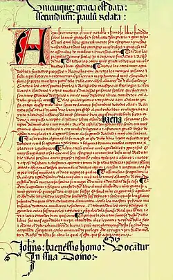 Not much is known of Juan Alfonso de Baena's life. However, it is known that Baena was born in the late 14th century in the town of Baena in Córdoba, Spain to Jewish parents.[1] According to research by José Manuel Nieto Cumplido, Baena's father was named Pero López and he grew up in the former Jewish quarter of Baena.[2] Other members of Baena's family, including his wife, children and nephew, were also uncovered during this research. Nieto Cumplido discovered that Baena's wife was called Elvira Fernández de Cárdenas, who was the daughter of Lope Ruiz de Cárdenas and María López de Luna.[3] Baena and his wife had at least two children, one also named Juan Alfonso de Baena and the second named Diego de Carmona.[4] Additionally, Baena's nephew (the son of Baena's brother Fernando Alonso de Baena), Antón de Montoro, was a fellow poet. Montoro was a used-clothes dealer called a ropero who also enjoyed wealthy patrons and used his talent at self-deprecating rhymes that highlighted his unfortunate appearance and Jewish blood.[5]